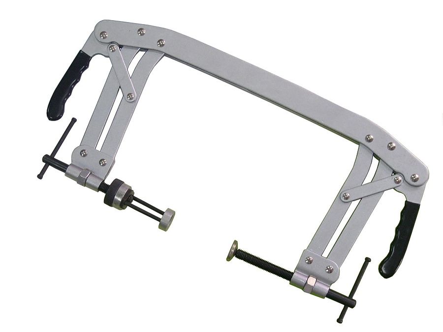 Фиксация струбцины в необходимом положении позволяет освободить руки для удобства демонтажа стопорных сухарей клапана.