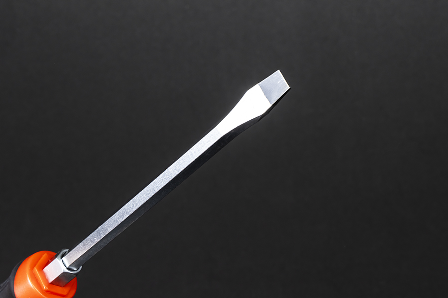 Отвертка изготовлена из высококачественной легированной хром-ванадиевой инструментальной стали, с последующей закалкой до твердости в пределах 46-48HRC, что соответствует всем требования нормативной документации. Наконечник проходит дополнительную термическую обработку с целью получения оптимального сочетания твердости и пластичности. Сквозная посадка стержня и металлический затыльник позволяют применять ударное воздействие. Шестигранный профиль у основания рукояти позволяет посредством ключа существенно увеличить усилие, передаваемое крепежу. Отвертка снабжена двухкомпонентной эргономичной рукоятью. Благодаря высококачественным компонентам рукоять имеют высокую стойкость к агрессивным средам.